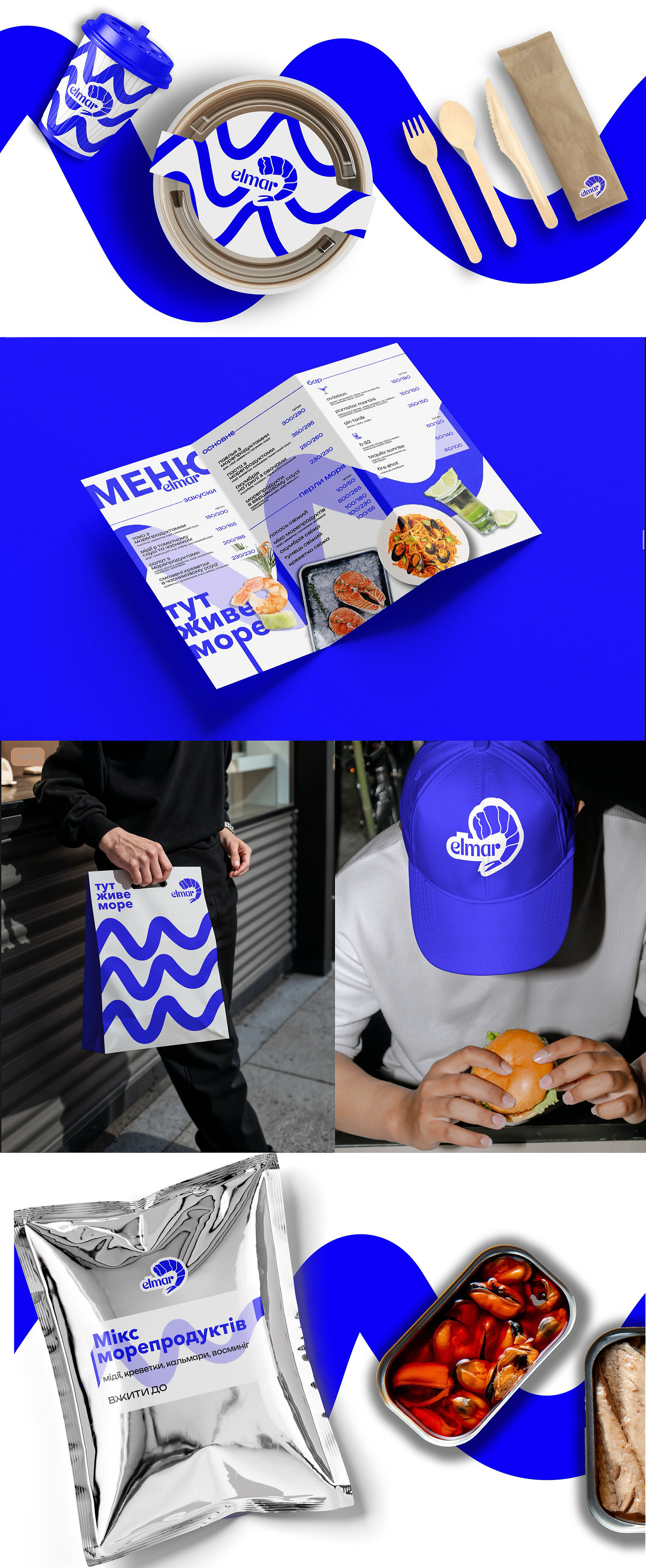 Elmar — Feel the Sea A branding and packaging concept for a seafood restaurant and product line inspired by the rhythm of the sea. The identity uses bold blue waves, minimalist typography, and dynamic patterns to capture freshness, motion, and the energy of the ocean.