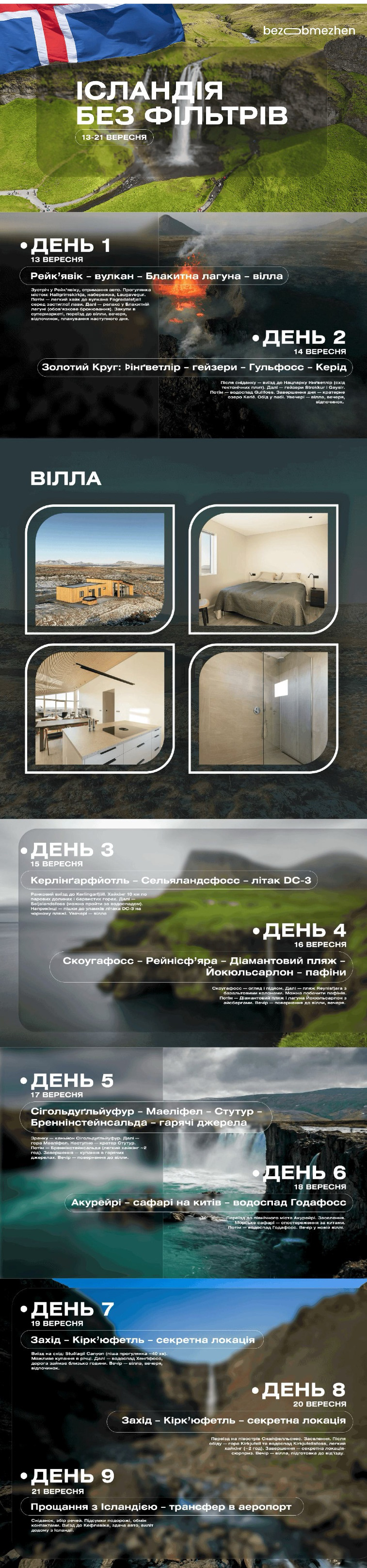 Iceland Without Filters — Presentation Design A presentation project created for a travel company to showcase a tour across Iceland. The concept emphasizes the country’s natural beauty through bold visuals, cinematic photography, and a clear day-by-day itinerary layout.