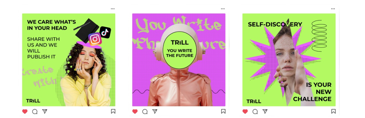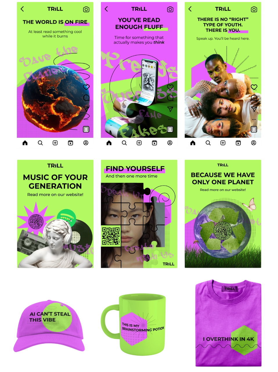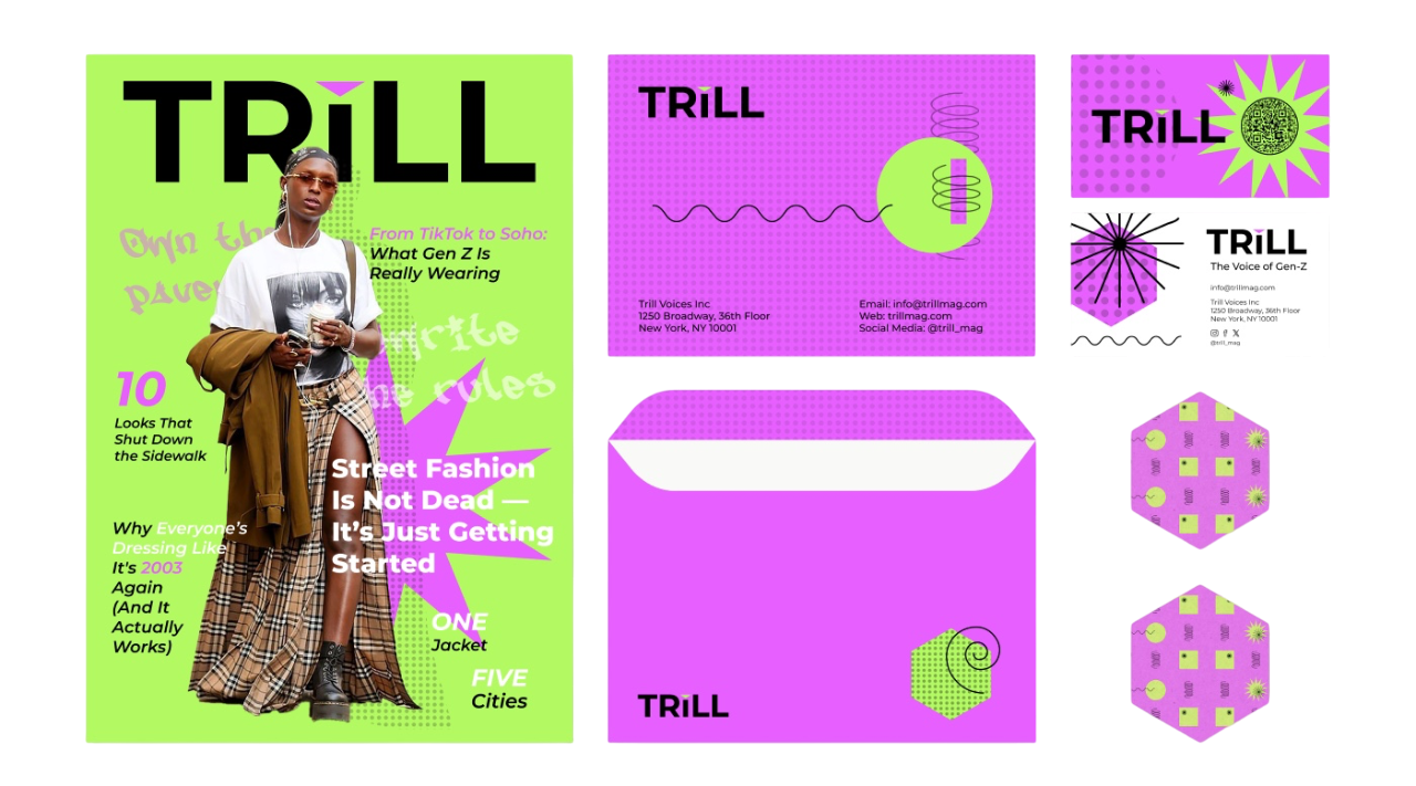 TRiLL — The Voice of Gen Z A conceptual identity for a digital magazine that speaks the language of today’s youth. The brand captures the rebellious, expressive, and playful energy of Gen Z — merging street culture, digital aesthetics, and self-irony. Neon contrasts, bold typography, and interactive visuals reflect the magazine’s mission: to give a voice to the new creative generation.