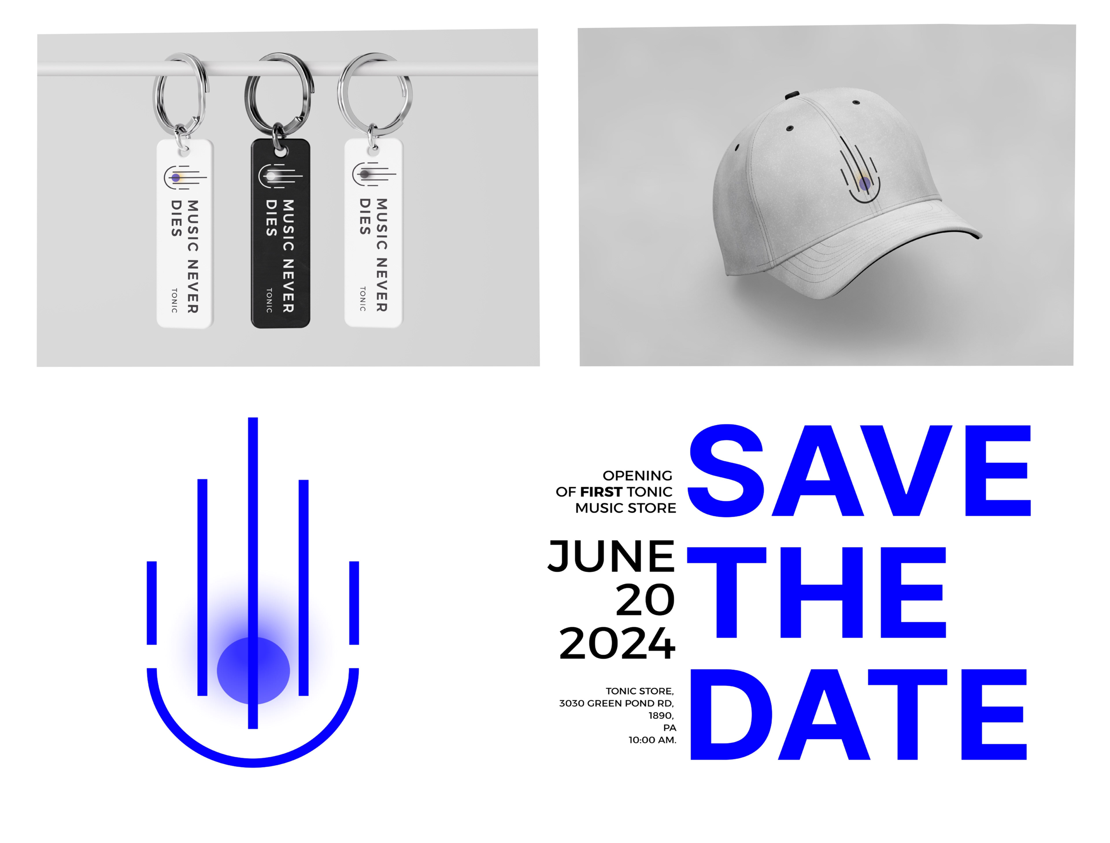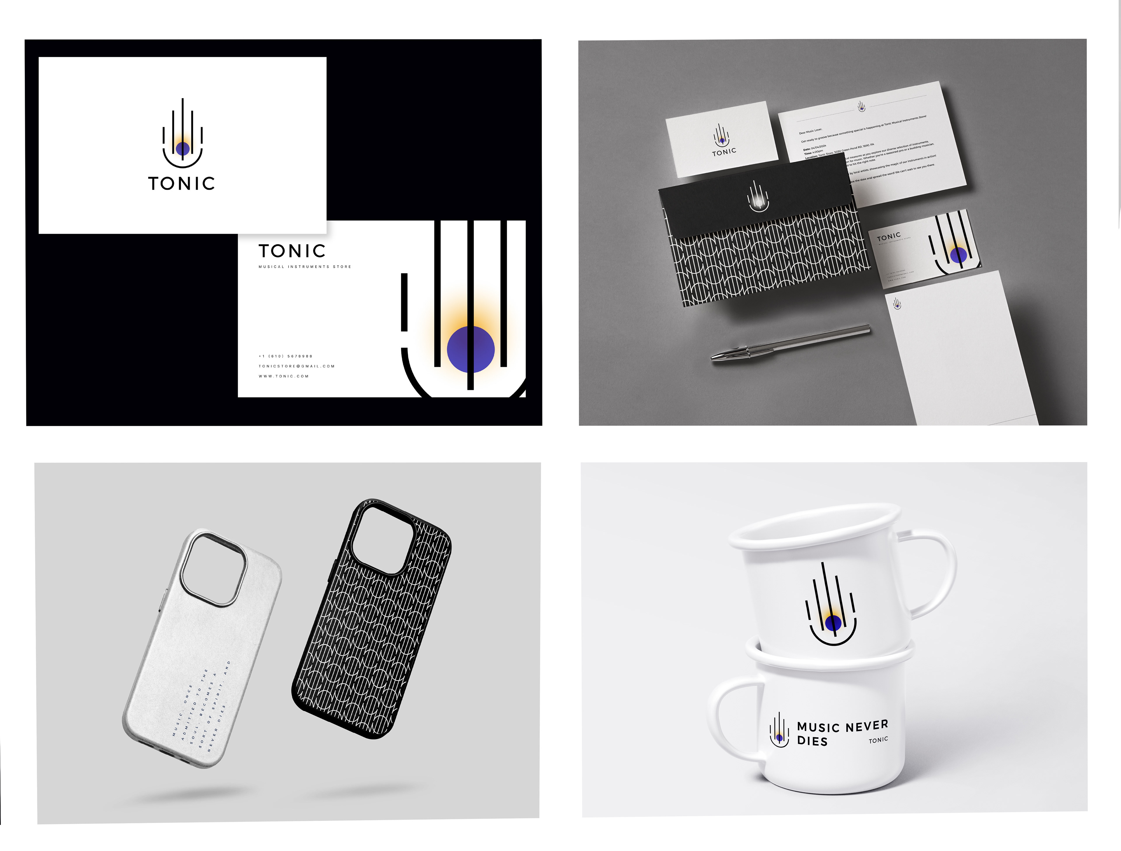 TONIC — Music Never Dies A branding project for a musical instruments store that redefines the visual language of sound. The logo combines rhythm and harmony — minimalist lines form both a soundwave and a musical symbol. The visual identity merges precision with emotion through bold typography and deep blue gradients.